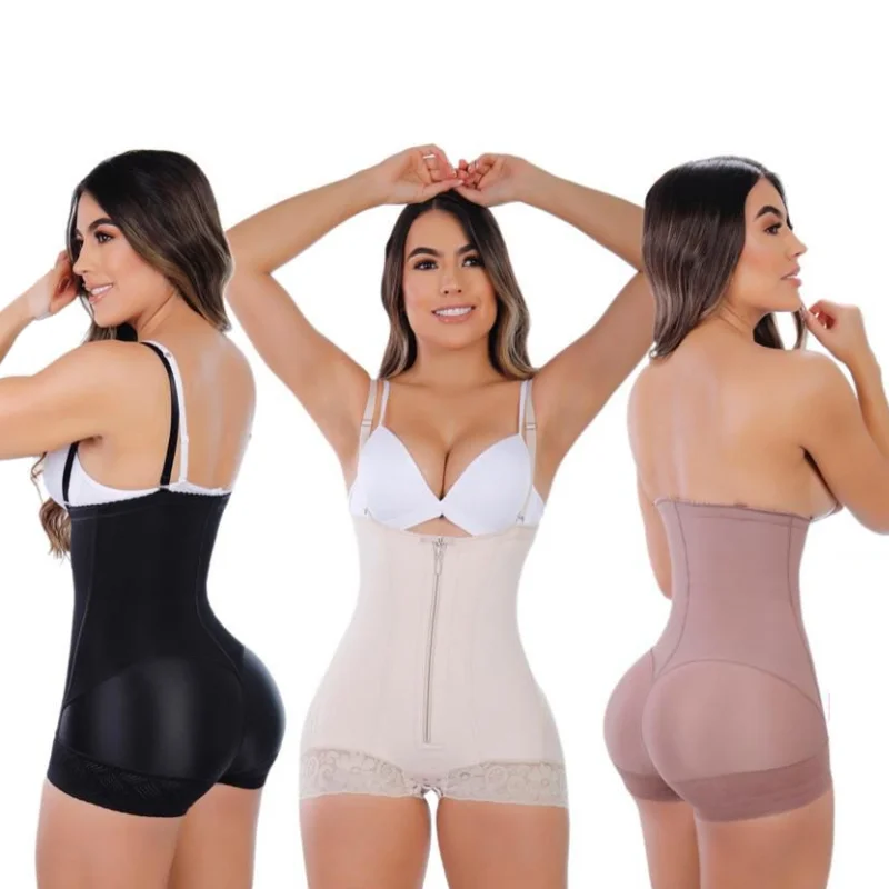 Faja F340 de alta compresión con cierre frontal y tirantes ajustables, diseñada para moldear abdomen, cintura y glúteos. Incluye detalles de encaje en las piernas para un toque elegante. Disponible en color Beige.