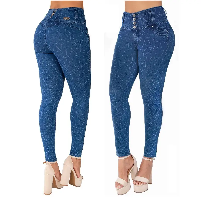 Luce increíble con estos jeans colombianos de tiro alto en color azul con un exclusivo estampado grabado. Su diseño con efecto push-up realza la figura, estilizando las curvas de manera natural y proporcionando un ajuste favorecedor.